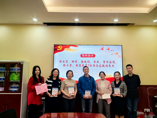 会议还组织全体党员研读学习了近期上级有关制度文件。大家一起为11月入党同志过政治生日,人力资源部副部长刘飞为每位党员送上党支部精心制作的政治生日贺卡,希望他们不忘入党初心,继续发挥党员先锋模范带头作用,为学校建设发展努力奋斗。
