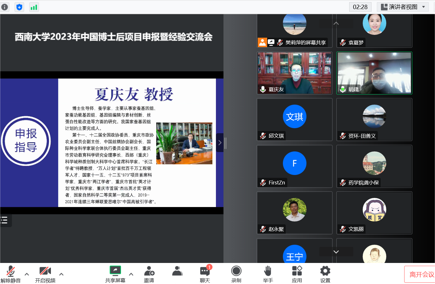 会议分三个阶段进行。第一阶段由博士生导师、蚕学家、博士后基金评审专家夏庆友教授做申报指导。夏庆友教授首先剖析了博士后应当如何看待自己的研究工作,鼓励博士后在研究工作期间应当不断增加研究工作的深度和广度,加强科研创新能力的淬炼;其次他进一步阐述了博士后在研究工作期间应当如何开展研究,勉励博士后在研究工作期间找准研究时机,科学凝练学科方向,逐步形成自主创新研究机制;最后他从项目选题的创新性、前瞻性,申报内容原创性,申报材料的细节问题等方面对博士后项目申报给出了指导性建议。