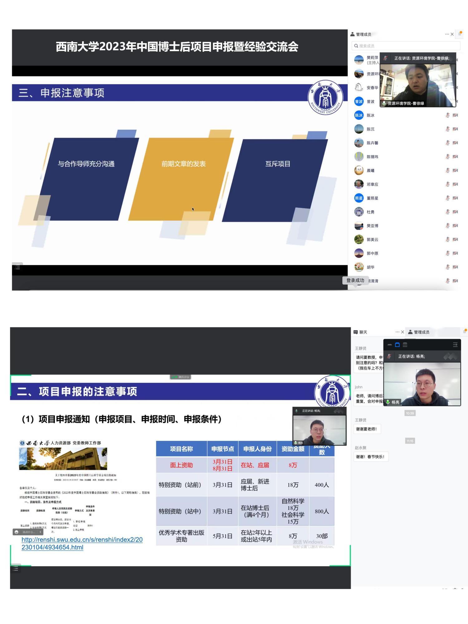 第三阶段由两位博士后做申报经验分享。农业资源与环境流动站博士后曹徐绿通过数据分析,从资助数量、申报资助比、评价指标、学科分布等方面做了引进项目申报经验分享;生物学流动站博士后杨亮以多次申报博士后科学基金项目的结果反馈为切入点,结合自身丰富的项目申报经验,从提前布局、选题凝练、内容打磨、不畏艰难的角度做了博士后科学基金项目申报的经验分享。两位博士后均表示,博士后工作期间,需要有科研工匠精神和不服输的科研态度,申报项目应报尽报,多参加项目论证会,不断提高科研创新能力。