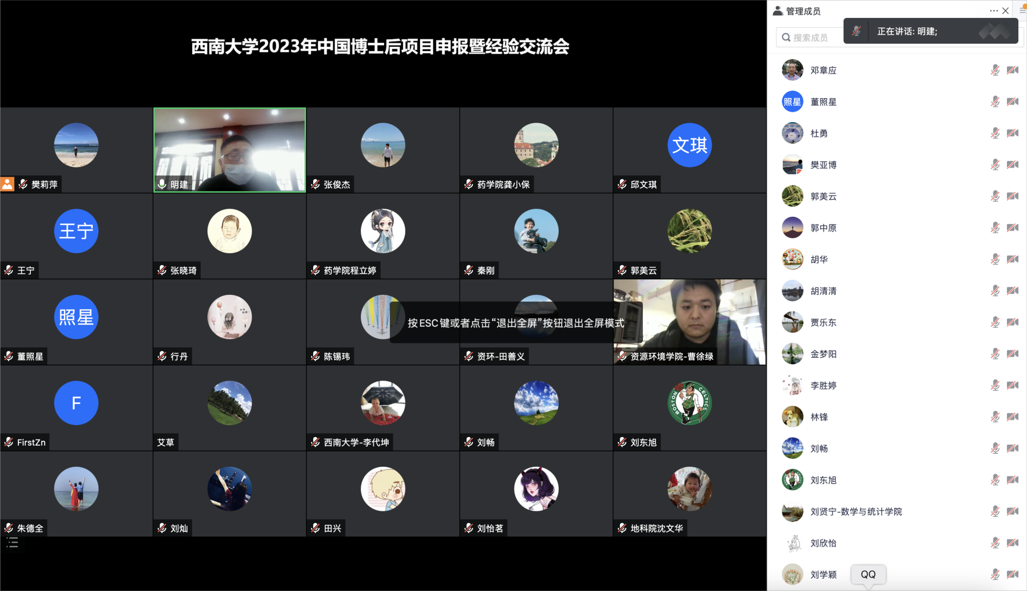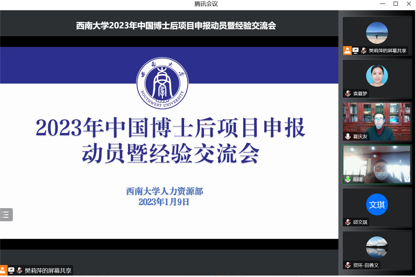 2023年1月9日,学校人力资源部召开2023年中国博士后项目申报动员暨经验交流会线上会议。会议由人力资源部副部长明建教授主持,博士后基金评审专家代表、中国博士后项目获得者代表、博士后合作导师代表、流动站(工作站)负责人及管理人员、在站博士后及应届博士毕业生等近150人参会。